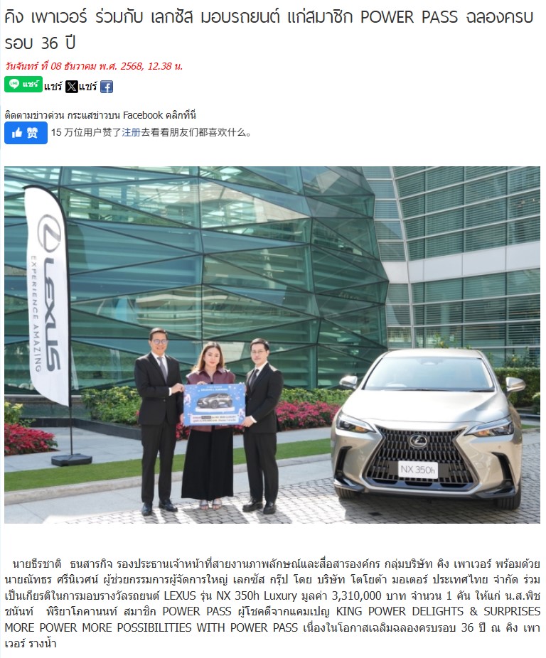 https://www.banmuang.co.th/news/marketing/457733#:~:text=%E0%B8%81%E0%B8%B2%E0%B8%A3%E0%B8%95%E0%B8%A5%E0%B8%B2%E0%B8%94-,%E0%B8%84%E0%B8%B4%E0%B8%87%20%E0%B9%80%E0%B8%9E%E0%B8%B2%E0%B9%80%E0%B8%A7%E0%B8%AD%E0%B8%A3%E0%B9%8C%20%E0%B8%A3%E0%B9%88%E0%B8%A7%E0%B8%A1%E0%B8%81%E0%B8%B1%E0%B8%9A%20%E0%B9%80%E0%B8%A5%E0%B8%81%E0%B8%8B%E0%B8%B1%E0%B8%AA%20%E0%B8%A1%E0%B8%AD%E0%B8%9A%E0%B8%A3%E0%B8%96%E0%B8%A2%E0%B8%99%E0%B8%95%E0%B9%8C%20%E0%B9%81%E0%B8%81%E0%B9%88%E0%B8%AA%E0%B8%A1%E0%B8%B2%E0%B8%8A%E0%B8%B4%E0%B8%81%20POWER%20PASS%20%E0%B8%89%E0%B8%A5%E0%B8%AD%E0%B8%87%E0%B8%84%E0%B8%A3%E0%B8%9A%E0%B8%A3%E0%B8%AD%E0%B8%9A%2036%20%E0%B8%9B%E0%B8%B5,-%E0%B8%A7%E0%B8%B1%E0%B8%99%E0%B8%88%E0%B8%B1%E0%B8%99%E0%B8%97%E0%B8%A3%E0%B9%8C%20%E0%B8%97%E0%B8%B5%E0%B9%88%2008%20%E0%B8%98%E0%B8%B1%E0%B8%99%E0%B8%A7%E0%B8%B2%E0%B8%84%E0%B8%A1