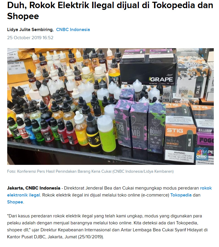 https://www.cnbcindonesia.com/tech/20191025164531-37-110246/duh-rokok-elektrik-ilegal-dijual-di-tokopedia-dan-shopee#:~:text=Duh%2C%20Rokok%20Elektrik%20Ilegal%20dijual%20di%20Tokopedia%20dan%20Shopee