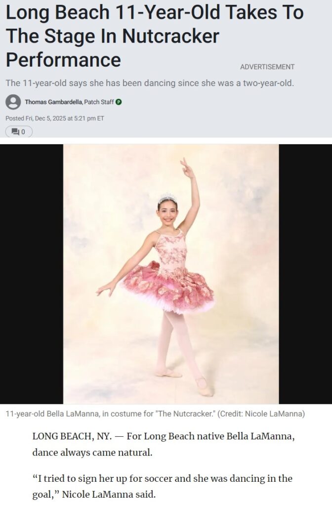 https://patch.com/new-york/longbeach/long-beach-11-year-old-takes-stage-nutcracker-performance#:~:text=Arts%20%26%20Entertainment-,Long%20Beach%2011%2DYear%2DOld%20Takes%20To%20The%20Stage%20In%20Nutcracker%20Performance,-The%2011%2Dyear