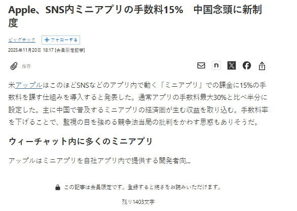 https://www.nikkei.com/article/DGXZQOGN1424K0U5A111C2000000/#:~:text=Apple%E3%80%81SNS%E5%86%85%E3%83%9F%E3%83%8B%E3%82%A2%E3%83%97%E3%83%AA%E3%81%AE%E6%89%8B%E6%95%B0%E6%96%9915%25%E3%80%80%E4%B8%AD%E5%9B%BD%E5%BF%B5%E9%A0%AD%E3%81%AB%E6%96%B0%E5%88%B6%E5%BA%A6