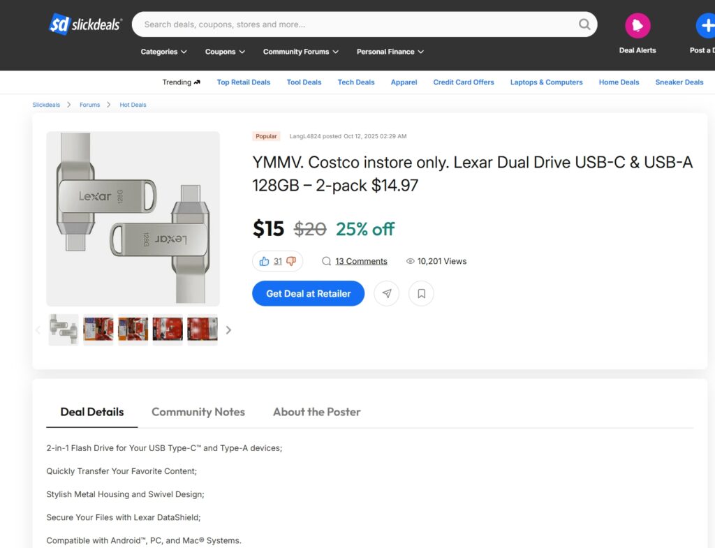 Lexar 双接口(USB-C + USB-A)128GB 闪存盘促销活动,2 支装售价 14.97 美元(原价约 20 美元,享 75 折优惠),页面标注 “popular”(热门)。产品具备双接口优势,适配 Android、PC、Mac 设备,方便跨设备传输,还采用时尚金属外壳与旋转设计,搭配 Lexar DataShield 加密功能保障文件安全;部分用户反馈其使用便捷,加密功能实用,且相比原价降低了单支使用成本,对追求性价比和基础跨设备存储需求的消费者有吸引力。 https://slickdeals.net/f/18691459-ymmv-costco-instore-only-lexar-dual-drive-usb-c-amp-usb-a-128gb-2-pack-14-97?attrsrc=JFYCarousel%3APosition%3A5%7CJFYCarousel%3AType%3Athread&src=jfy_carousel